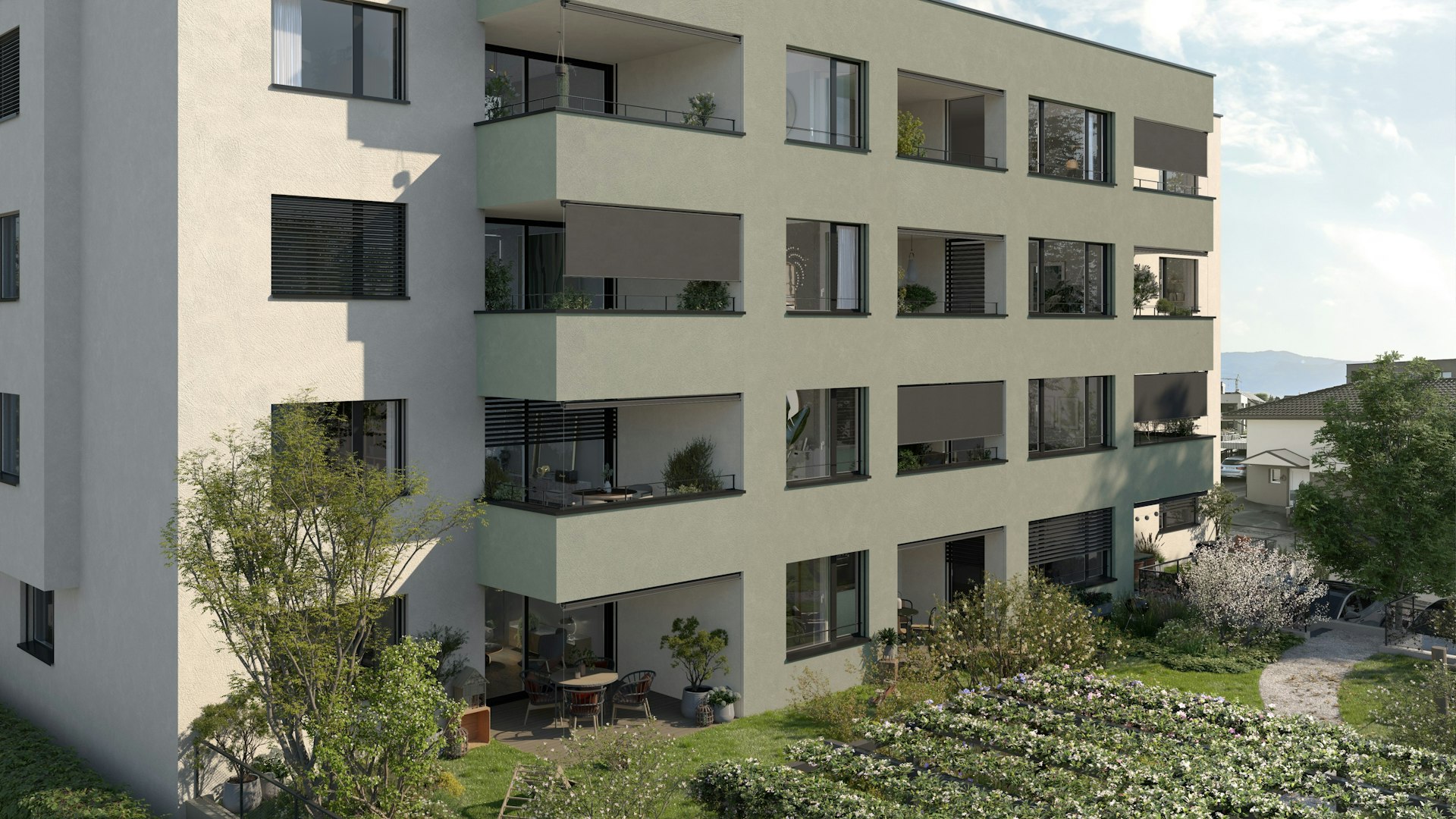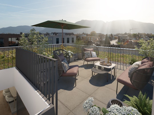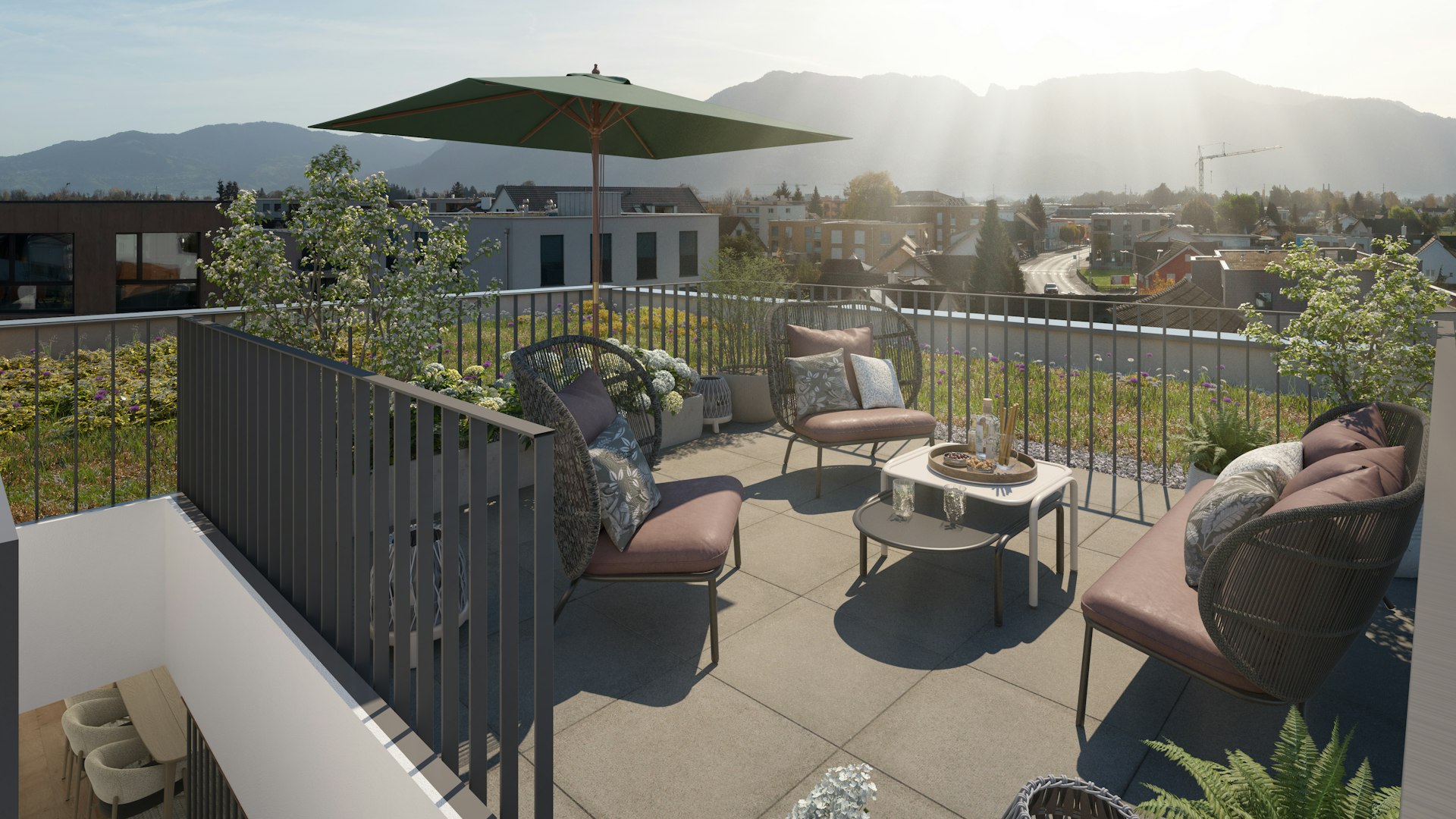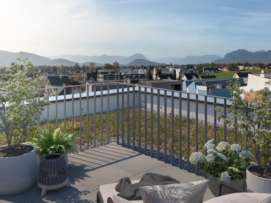 Die Dachgeschosswohnungen erhalten eine eigene, grosszügige Dachterrasse. Diese sind von einem in der Wohnungen liegenden Treppenaufgang zugänglich.